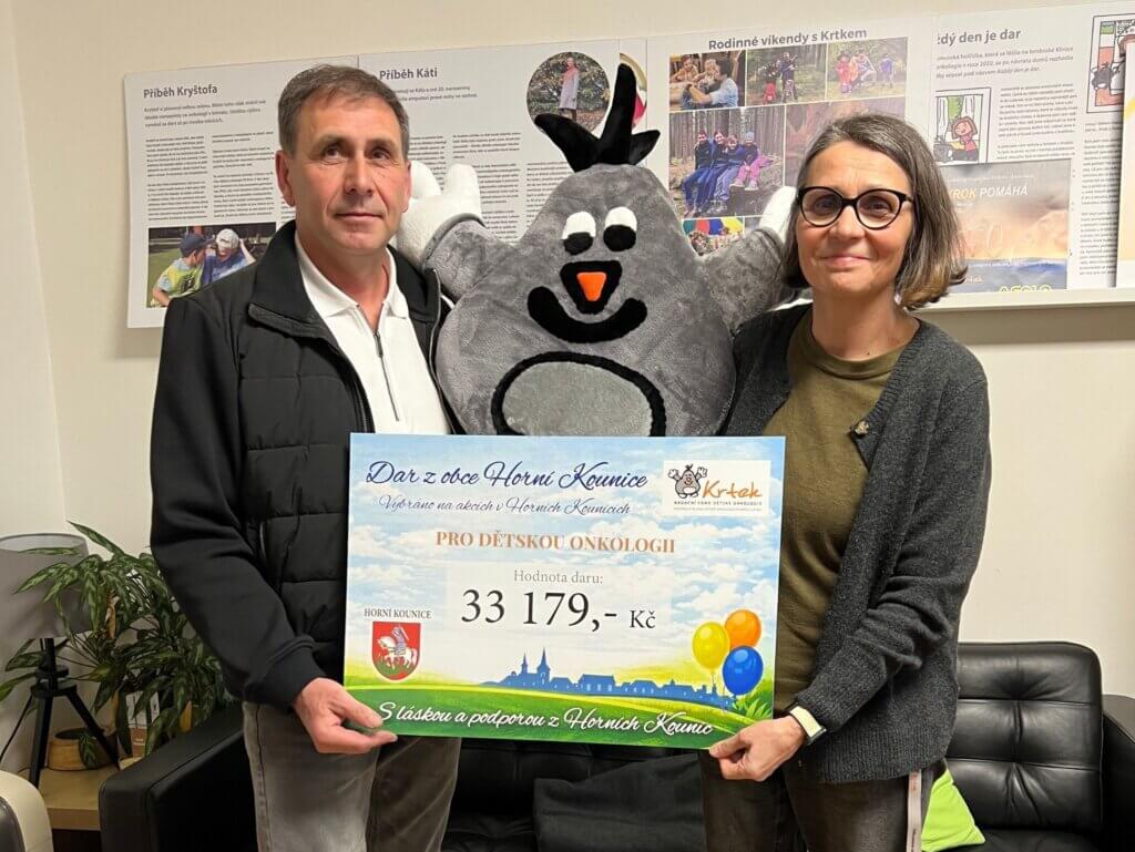 Krásnou podporu jsme přijali od pana starosty Obce Horní Kounice, který nám předal výtěžek 33.179 Kč z kulturních akcí pořádaných během uplynulého roku.